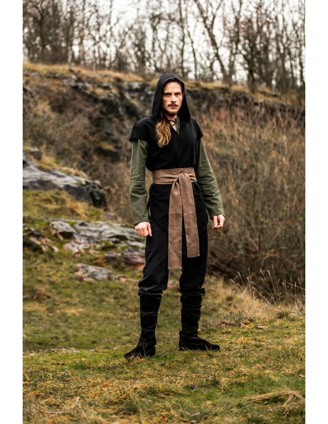 La texture opaca e leggermente ruvida del tessuto conferisce un carattere rustico e con reminiscenze antiche, perfetto per aggiungere autenticità senza sforzo. Essendo in lino, mantiene una sensazione naturale e confortevole che accompagna in eventi all'aperto come in ricreazioni dove il realismo e l'aspetto contano.