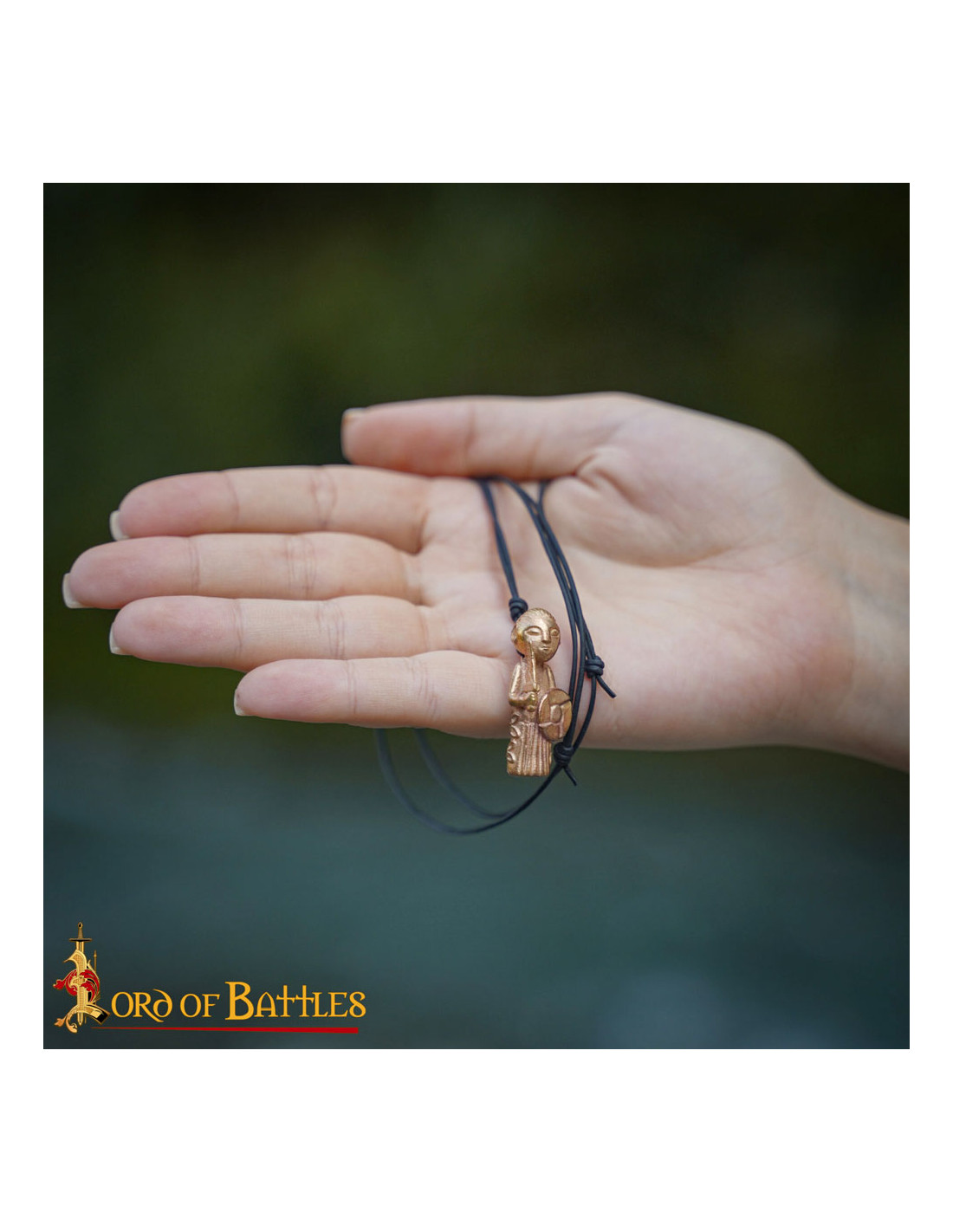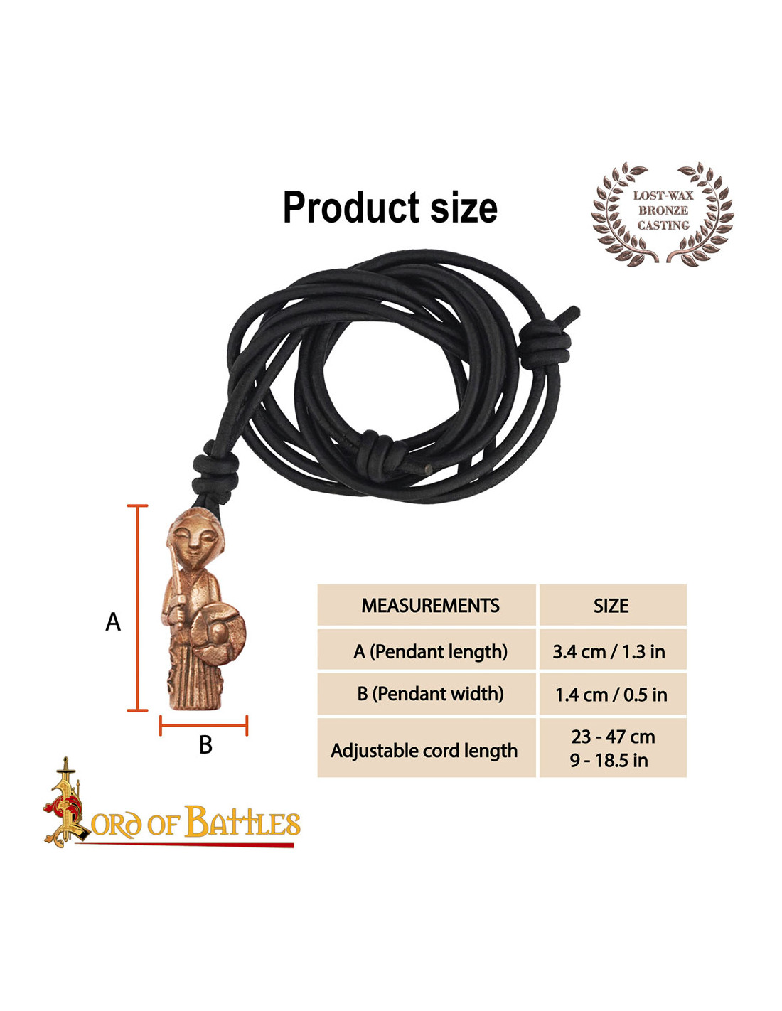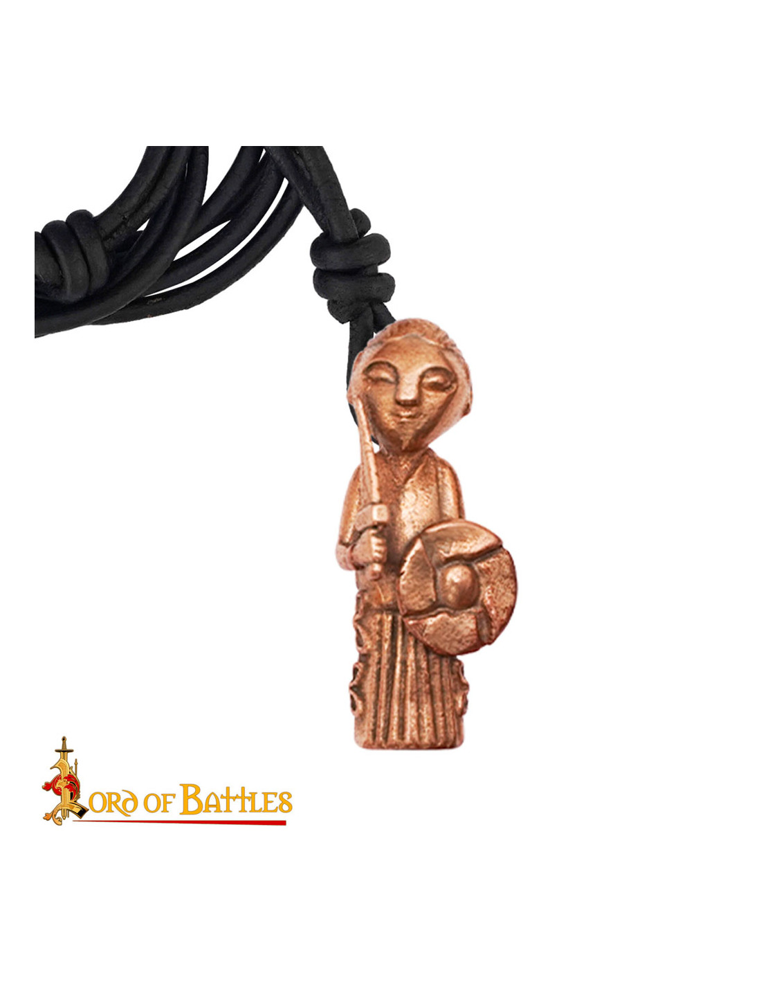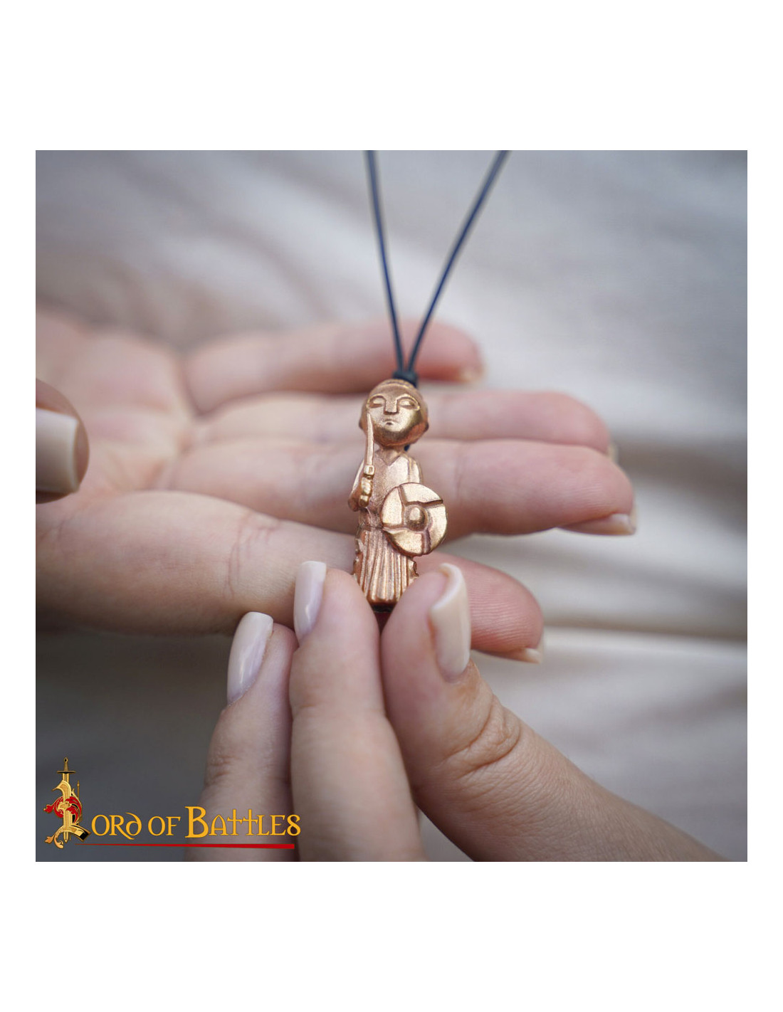 Il design del ciondolo si distingue per la figura di una valchiria con il suo scudo e arma, elementi emblematici che evocano potere e protezione. Lo scudo, con dettagli in rilievo, conferisce un tocco decorativo unico, mentre l'arma, probabilmente una lancia, simboleggia l'abilità di queste imponenti guerriere. Questo livello di dettaglio rende il pezzo un accessorio ideale per coloro che apprezzano la storia, la fantasia o cercano un gioiello che narri una potente storia epica.