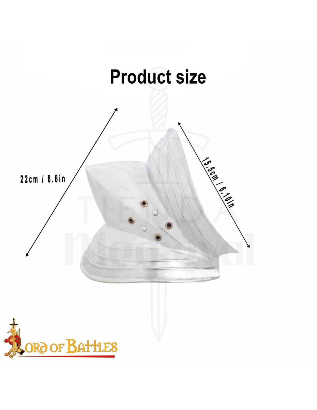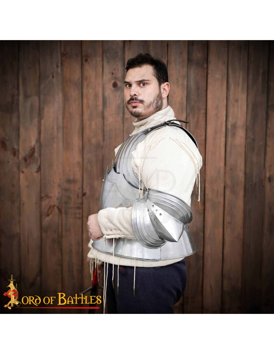 Il dettaglio dei piccoli fori metallici a pattern triangolare aggiunge un tocco storico e pratico, facilitando la ventilazione e evitando il surriscaldamento in azioni prolungate. La finitura riflettente e la simmetria tra il pezzo sinistro e destro assicurano un aspetto uniforme e professionale sopra il gambeson o il haubergeon, elevando l'insieme senza sovraccaricarlo visivamente.