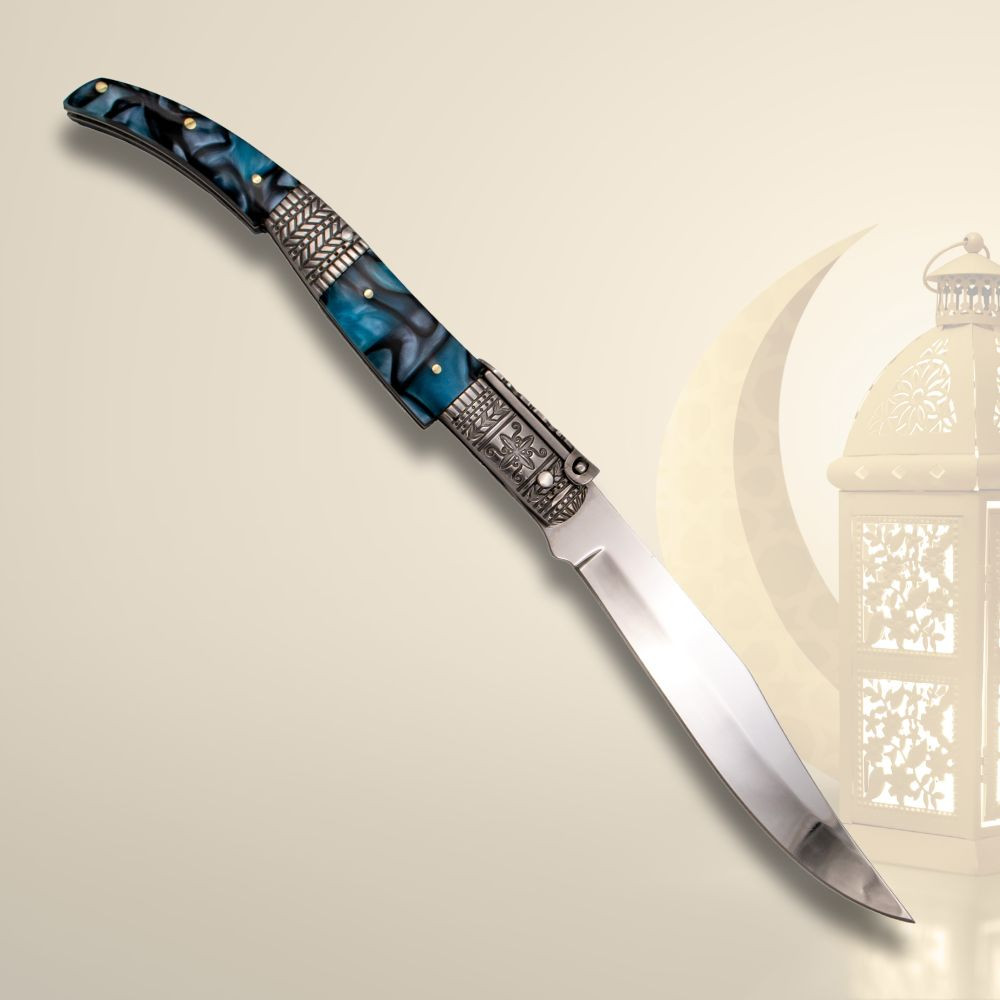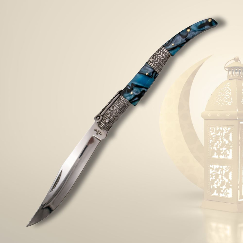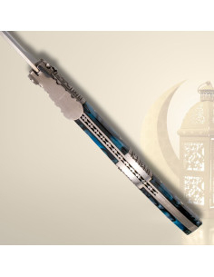 Il suo manico, una fusione di acciaio inossidabile con inserti in acrilico blu, è progettato meticolosamente con un basso rilievo decorativo, ispirato alle navajas classiche spagnole del XIX secolo. Questo non solo garantisce una presa comoda e sicura, ma trasforma anche ogni utilizzo in un autentico omaggio all'eredità artigianale del passato.