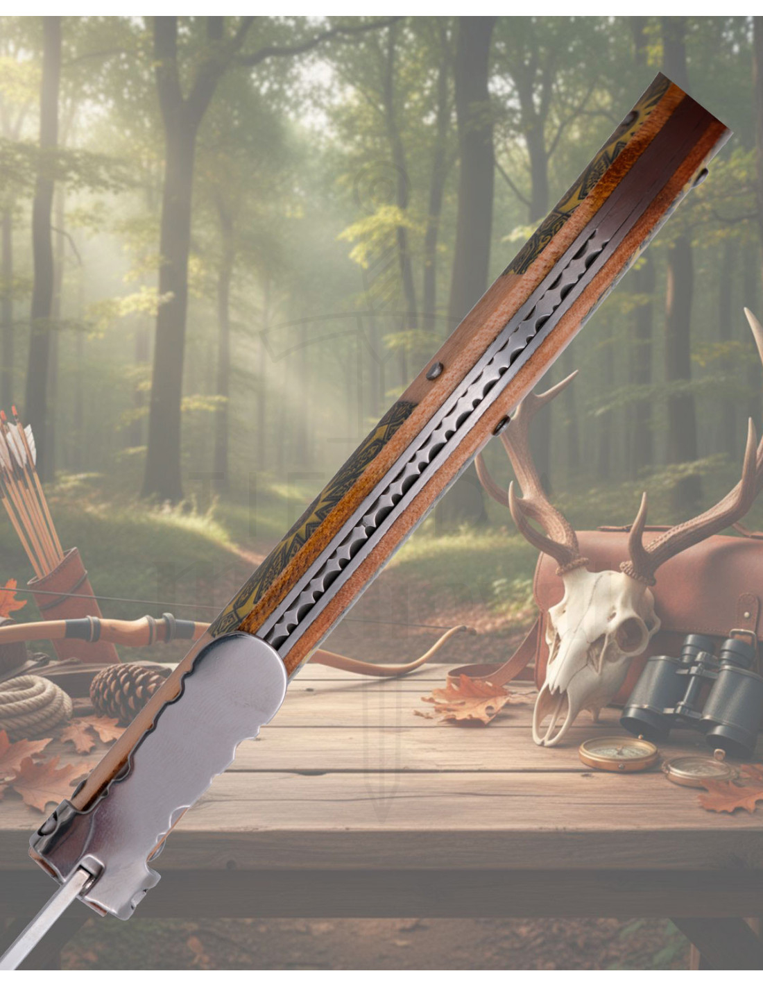 Il manico in legno d'Acero apporta calore e motivo naturale a ogni impugnatura, mentre l'imprimatura di imitazione damasquino in tonalità dorato e nero trasforma il finale in un dettaglio ornamentale con presenza. Questa combinazione non solo conquista lo sguardo, ma facilita anche una presa comoda e sicura, ideale per un uso continuato o per esporla nella tua collezione.
