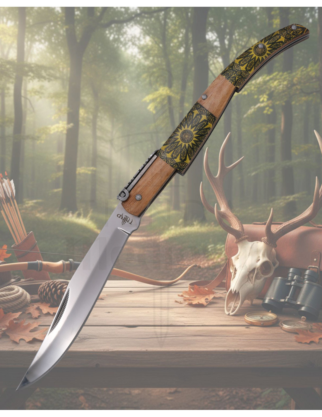 Il design pieghevole incorpora una cerniera robusta e un blocco laterale, offrendo portabilità e protezione quando viene riposta. Viti visibili e dettagli decorativi nel molle e nella palanquilla sottolineano una lavorazione curata, che combina estetica e resistenza in ogni elemento.