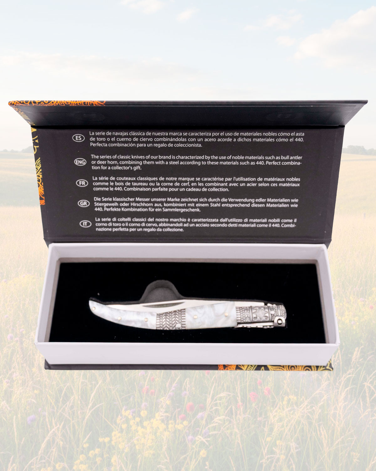 Coltello a molla Third mango decorato in taracea, serie Legno d'Acero