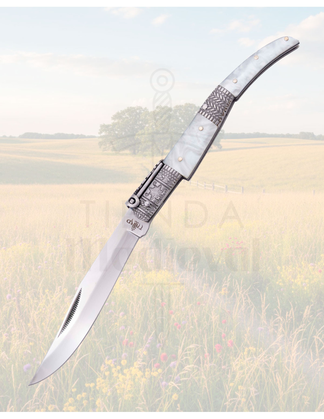 Il design curvo del manico si adatta alla mano, offrendo una presa sicura e comoda ad ogni utilizzo. Le inserzioni bianche in madreperla donano un tocco di eleganza, mentre le brugole in acciaio con rilievo sobrio testimoniano una lavorazione che rispetta le forme classiche senza rinunciare alla funzionalità contemporanea.