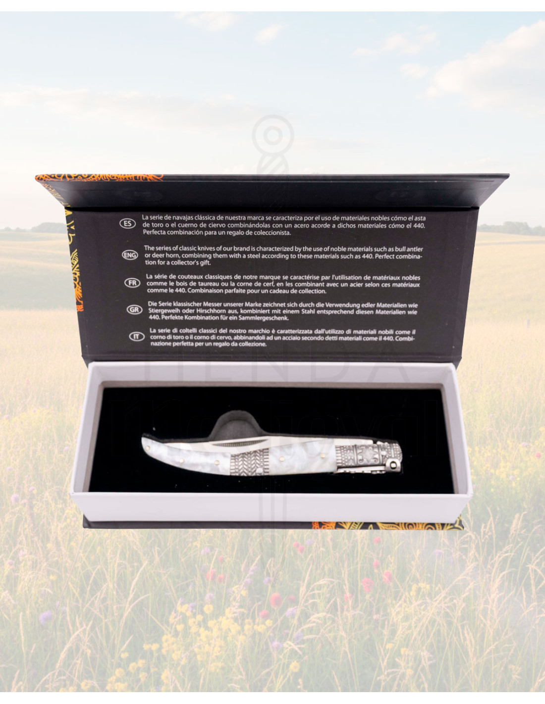 Viene consegnata in una scatola da presentazione, pronta da regalare o conservare con cura. Questa miscela di tradizione e precisione moderna si percepisce al tatto, nella lucentezza della lama e nel dettaglio decorativo di ogni particolare.