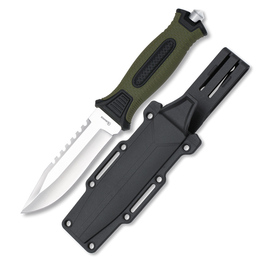 L'impugnatura è realizzata in ABS e gomma verde, fornendo una presa comoda e sicura, anche in situazioni bagnate o piovose. Inoltre, include una custodia rigida per il trasporto e lo stoccaggio, che ti permette di portarlo con te ovunque in tutta sicurezza. Che sia per il campeggio, la caccia o l'uso militare, questo coltello è uno strumento affidabile e robusto che non ti deluderà.