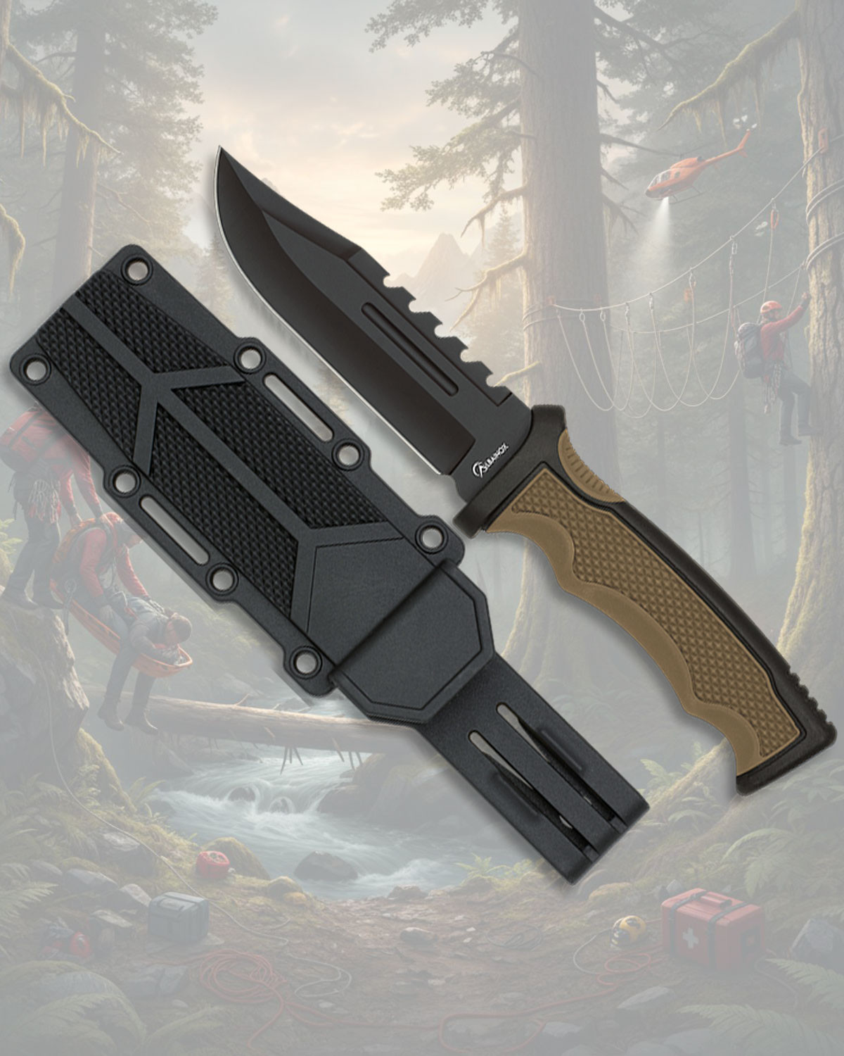 Il design sobrio della lama nera con taglio dritto e punta curva offre tagli precisi e una prestazione affidabile in compiti di precisione, mentre la sezione scanalata vicino al manico aggiunge funzionalità pratica per lavori puntuali senza complicazioni. Se vuoi comprare Coltello tattico Albainox modello coyote con fodero, troverai in questo modello un pezzo curato per chi apprezza l'equilibrio tra forma e utilità.