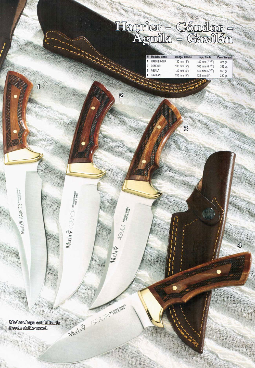 Se stai cercando coltelli di alta qualità e prestazioni, i modelli Harrier, Cóndor, Águila e Gavilán con lame piene, manici in legno inciso e ottone, prodotti dal marchio spagnolo Muela, sono strumenti eccezionali per le tue avventure sul campo.