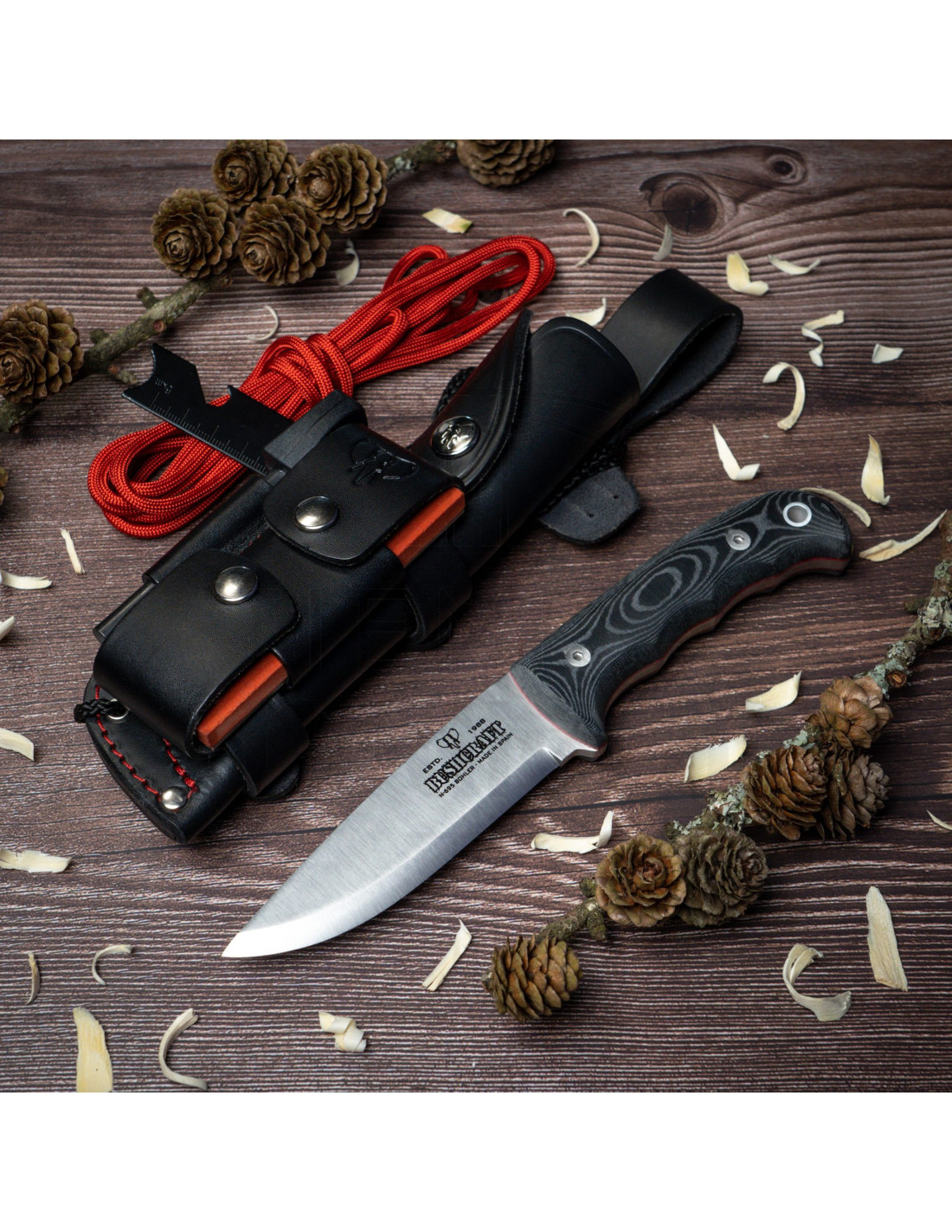 Include una fodera in cuoio nero multiposizione, ideale per un trasporto sicuro e comodo, insieme a pratici accessori: pietra focaia, pietra per affilare, specchio di segnale, paracord di 280 cm e attacco in cuoio per portare strumenti aggiuntivi.
