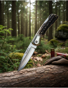 Questo coltello con blocco e impugnatura in corno di cervo sorprende al primo contatto: la sua lama in acciaio lucido offre un filo dritto e una punta fine pensata per tagli precisi, mentre il rinforzo metallico lucido tra lama e manico conferisce una sensazione di solidità e controllo in ogni utilizzo. Il sistema di chiusura con blocco garantisce che la lama rimanga fissa quando ne hai bisogno, e il meccanismo visibile trasmette fiducia nell'apertura e nella chiusura.