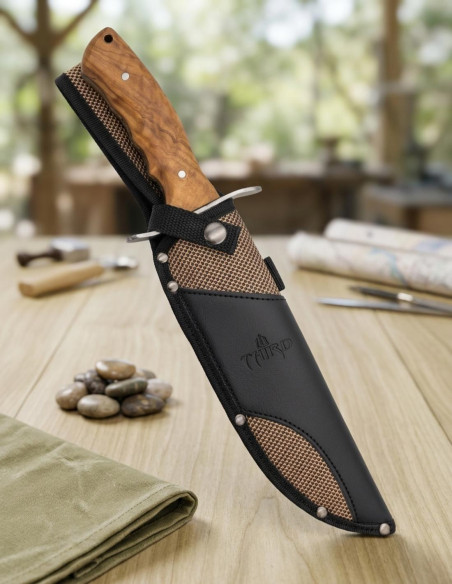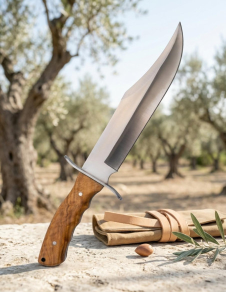 Il modello Third Bowie sfrutta la durezza senza sacrificare l'eleganza, fondendo una lama in acciaio 440 di 24 cm, satinata, che non solo taglia, ma potenzia; e un manico in legno di olivo che senti tra le mani, quella miscela di fermezza e tradizione. Ogni taglio, ogni movimento, sottolinea la tua perfezione in azione, mentre il peso di 513 grammi diventa parte della tua presenza. Il fodero, in nylon resistente e pelle, rafforza la tua necessità di avere tutto a portata di mano e al suo posto, così che con un semplice movimento sei pronto all'azione, senza perdere tempo né nervi. Questo coltello non è solo uno strumento, è un simbolo di potere pratico che eleva i tuoi giorni nella natura a una storia di dominio ed efficacia.