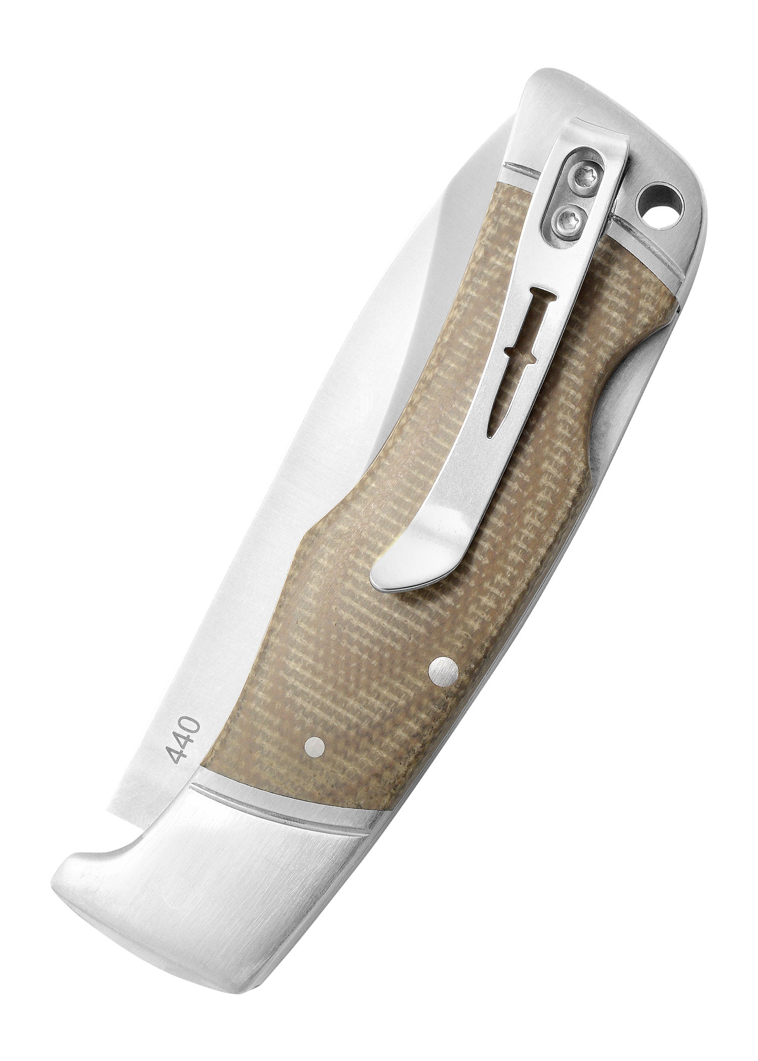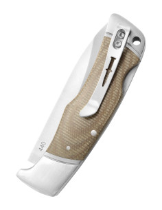 - Manico ergonomico in Micarta: Il manico è realizzato in Micarta, un materiale composto da più strati impregnati di resina sintetica. Ciò garantisce un'ottima presa anche in condizioni di bagnato e una notevole resistenza agli sbalzi di temperatura e umidità.