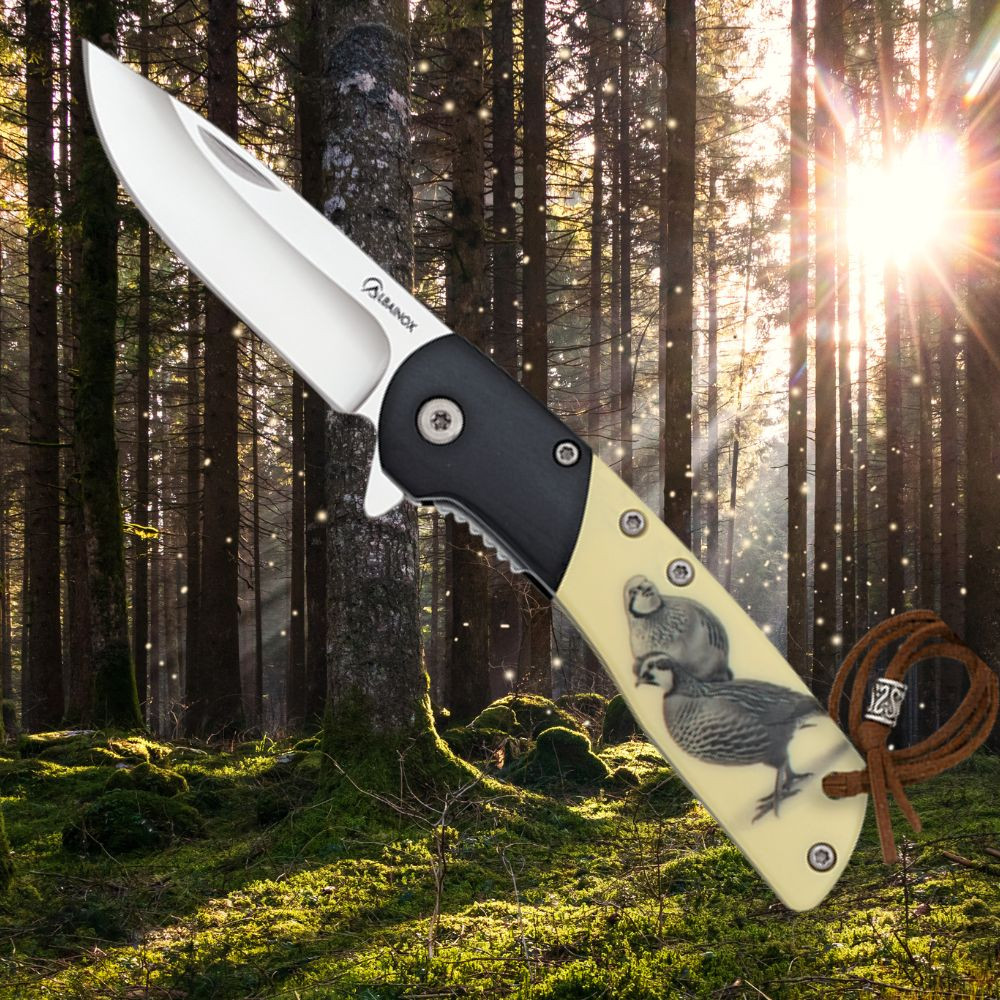 Con una lama realizzata in acciaio 3CR13MOV, assicura un taglio preciso e resistenza a lungo termine. La sua finitura satinata gli conferisce un aspetto raffinato e professionale. Inoltre, il suo manico combina legno nero e ABS, offrendo una presa ferma, comoda ed elegante. Include un'incisione esclusiva di una pernice sul manico, un dettaglio che non solo mette in risalto la sua estetica, ma le conferisce un carattere unico.