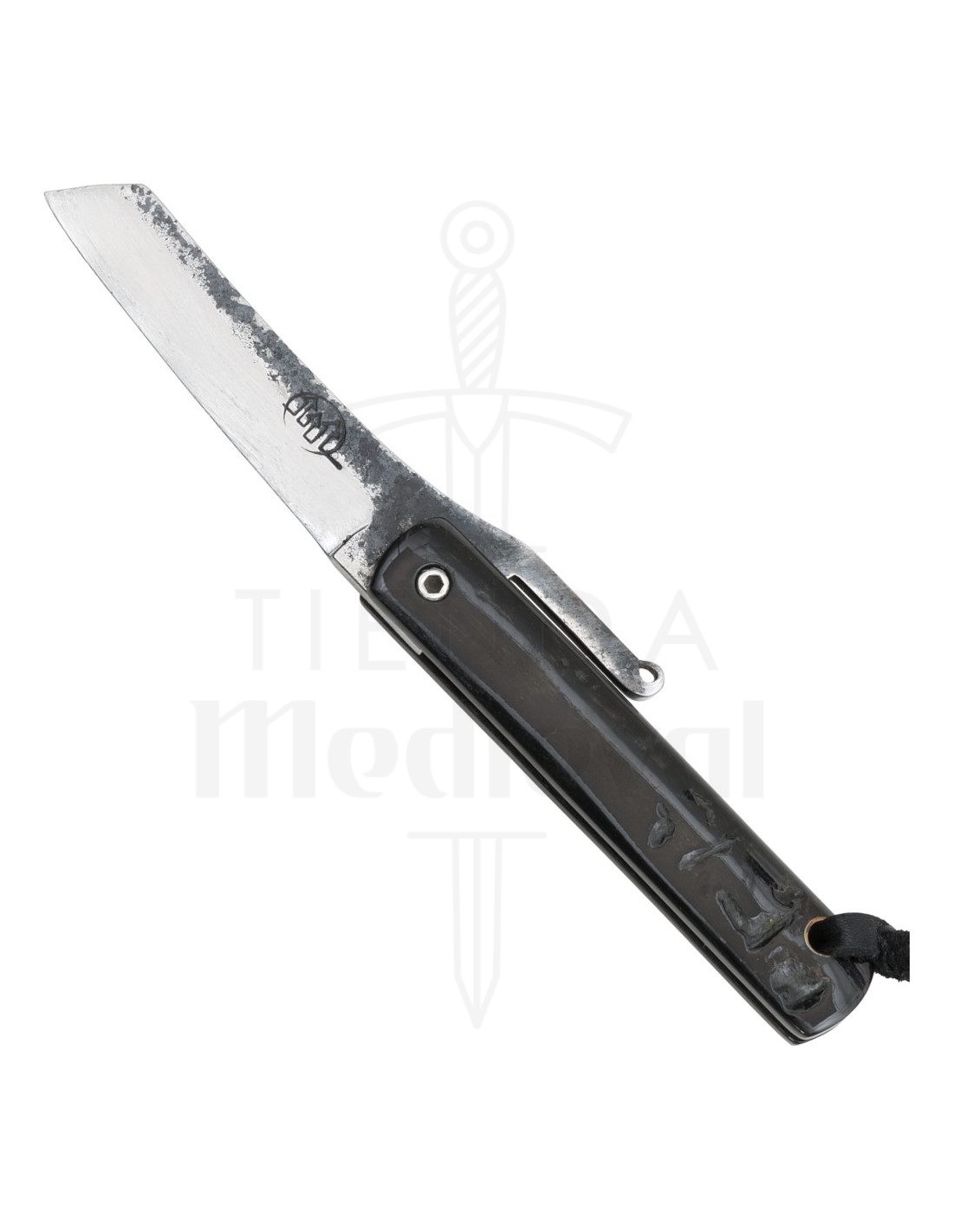 Il corpo, lavorato da un'unica pezzo di corno, piegato e modellato con cura, offre una presa ergonomica che si adatta alla mano e guadagna carattere con l'uso, grazie alle variazioni naturali del materiale. Ogni coltello mostra un motivo unico, rendendo ogni unità esclusiva e visivamente attraente nel trasportarla in tasca.