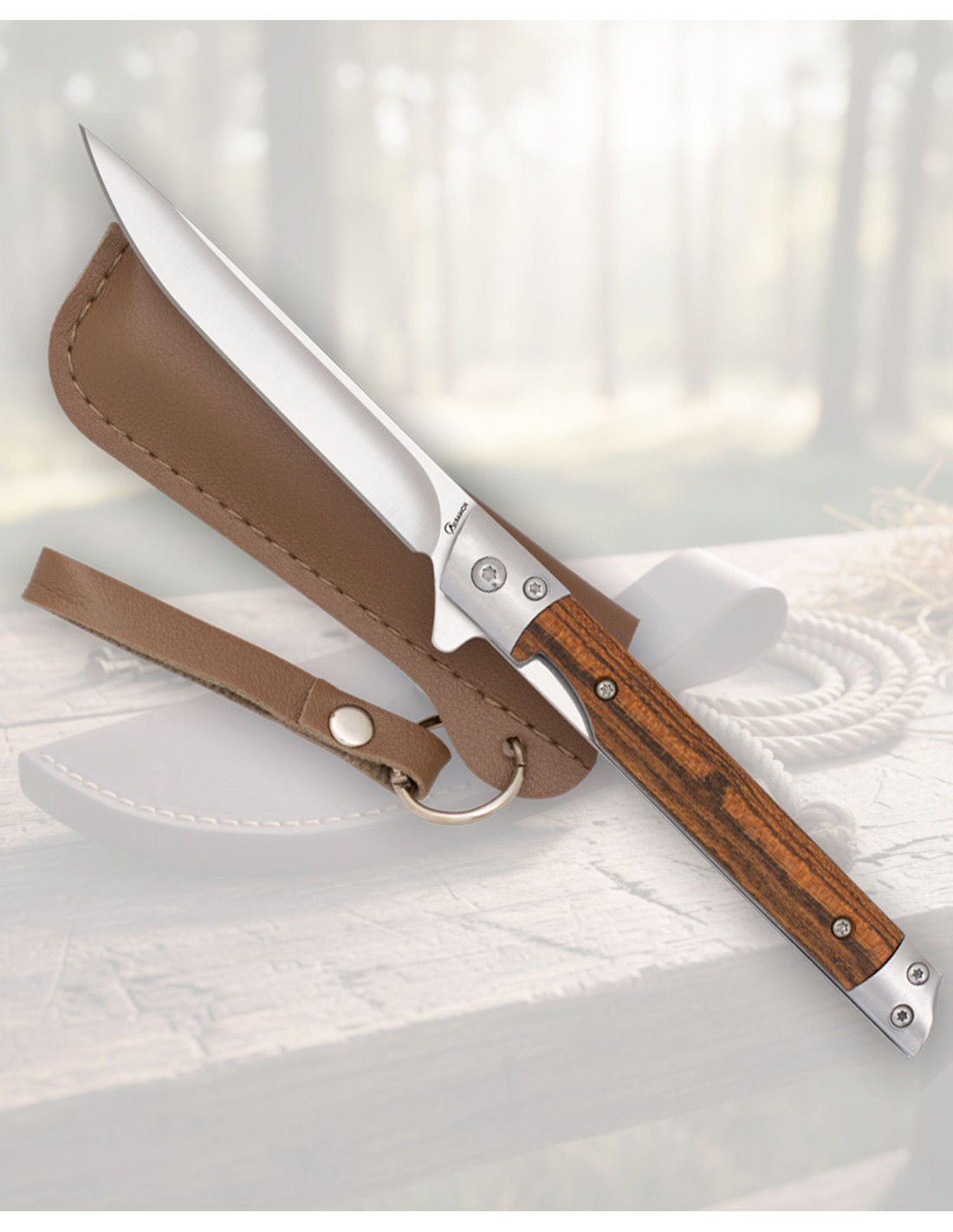 La custodia in similpelle marrone, con cuciture visibili, anello metallico e cinturino con bottone a pressione facilita il trasporto del coltello fissato alla cintura o appeso con stile, mantenendolo protetto e accessibile. Viene presentato in una scatola colorata, pronto per essere regalato oppure per una conservazione sicura.