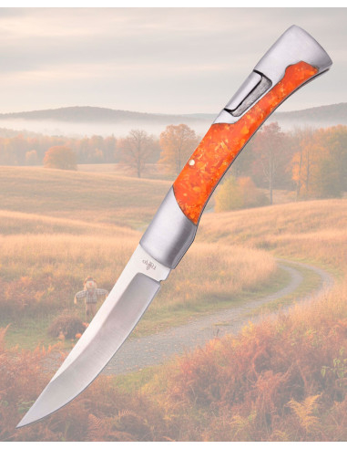 Il manico unisce acciaio e un'inserzione di acrilico arancione fluorescente con venature marmorizzate, rendendolo un pezzo facile da individuare anche in condizioni di scarsa illuminazione. Il suo design curvo abbraccia la mano in modo ergonomico, fornendo una presa sicura e una sensazione di controllo prolungato, mentre le guarnizioni metalliche lucide rafforzano la durabilità e l'aspetto premium.