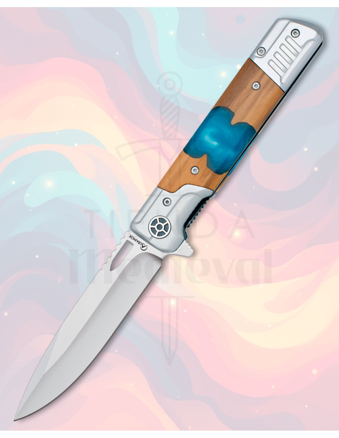 Il manico, con legno e un inserto acrilico blu traslucido, non solo conferisce personalità, ma migliora la presa grazie a una zona anatomica in rilievo, per lavorare con fermezza e comfort anche in compiti prolungati. I dettagli metallici alle estremità e vicino alla lama gli conferiscono un aspetto robusto e curato.