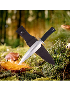 Questo coltello si distingue per la sua lama realizzata in acciaio inossidabile X50CrMoV15, conosciuta per la sua resistenza e durata. Con una durezza di 57-58 HRC, offre un equilibrio perfetto tra affilatura e robustezza. Il suo design a lama intera garantisce la solidità, ideale per le esigenze della montagna e della caccia.