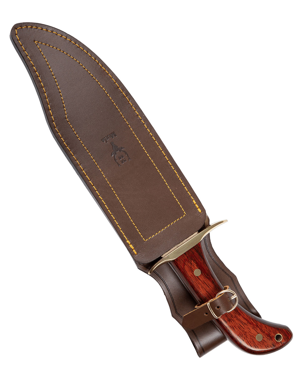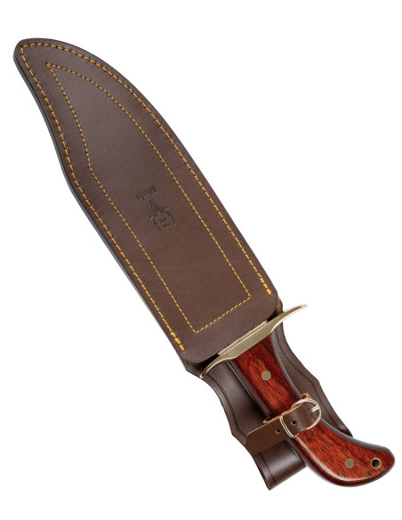 Il manico in legno pressato palorojo offre una superficie liscia e calda al tatto, con venature visibili che esaltano il suo carattere naturale. La sua forma ergonomica, rinforzata da tre rivetti dorati, garantisce una presa stabile e comoda durante lunghe giornate, mentre l'orificio finale consente di fissare il coltello o appenderlo per un accesso rapido.