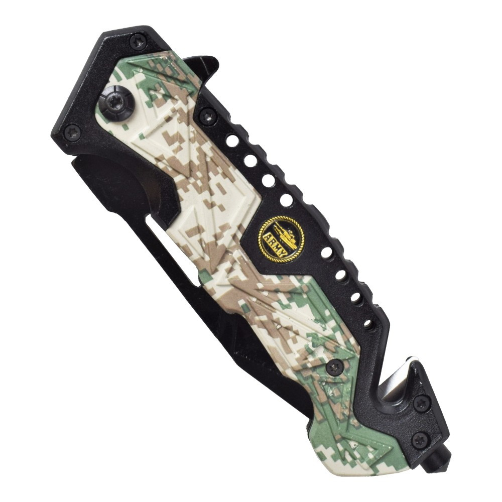Preparati a qualsiasi situazione di emergenza con il coltello SCK Urban Camo Army Rescue Knife! Questo strumento essenziale è progettato per offrirti la massima funzionalità e sicurezza in situazioni critiche. Dotato di una lama nera in acciaio inossidabile di alta qualità, questo coltello offre una durata eccezionale e un'affilatura costante, anche nelle condizioni più difficili. Il design ergonomico del manico in alluminio e plastica offre una presa sicura e confortevole, consentendoti di maneggiarlo con precisione e facilità. La funzione di apertura assistita a molla ti dà una risposta rapida, assicurandoti di essere pronto in pochi secondi. Inoltre, il suo sistema di bloccaggio Liner Lock mantiene la lama saldamente in posizione, fornendo sicurezza e stabilità durante l'uso.