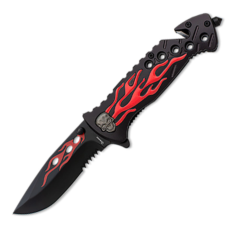 Preparati ad affrontare qualsiasi sfida con il coltello rosso Flaming Skull Rescue di Albainox! Il RED SKULL è molto più di un semplice coltello; È il tuo compagno fidato in situazioni critiche.