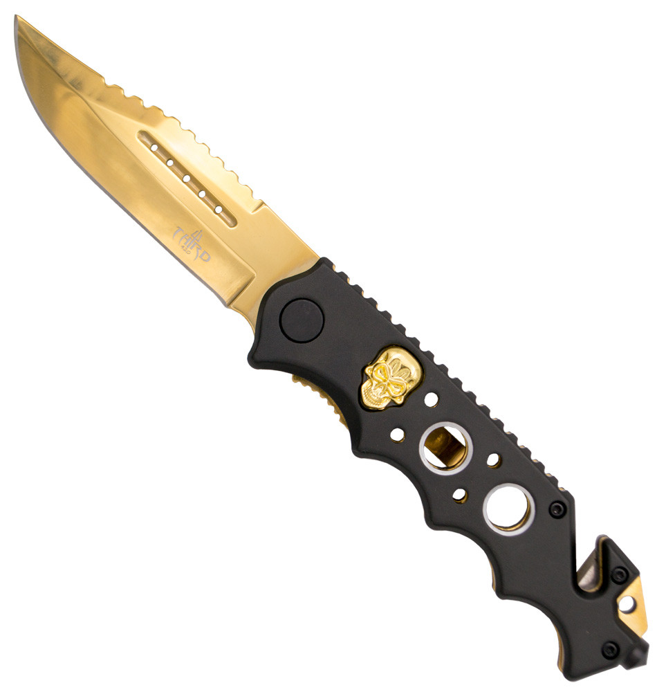 Il coltello tattico Third gold Skull design è perfetto per chi cerca uno strumento funzionale dal design sorprendente e distintivo.