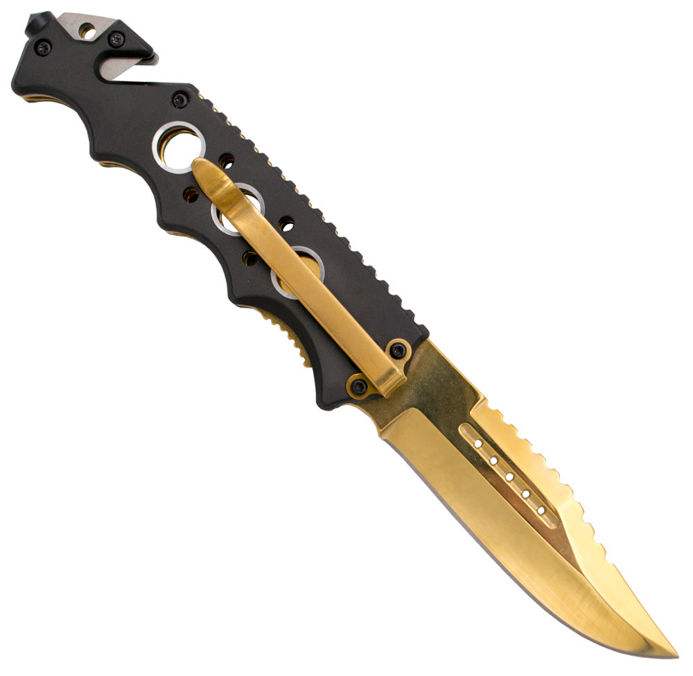 Scopri il coltello tattico Third con disegno teschio in oro, un pezzo che unisce eleganza e robustezza in un unico design. Il manico in alluminio nero, decorato con fori e con un teschio inciso, garantisce una presa salda e distintiva, distinguendosi per il design audace e moderno.
