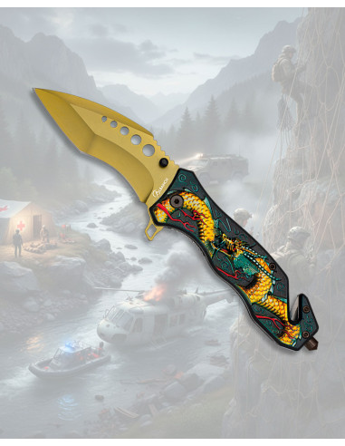 Il Coltello tattico di salvataggio Albainox drago giallo fonde una finitura dorata sulla lama, con una curvatura progettata per tagli precisi, il che si traduce in manovre più controllate ed efficaci nei momenti più critici. La finitura lucida facilita il ritrovamento in situazioni di scarsa illuminazione, mentre la costruzione con fodere in acciaio e blocco liner lock fornisce una sensazione di solidità e sicurezza ad ogni utilizzo.