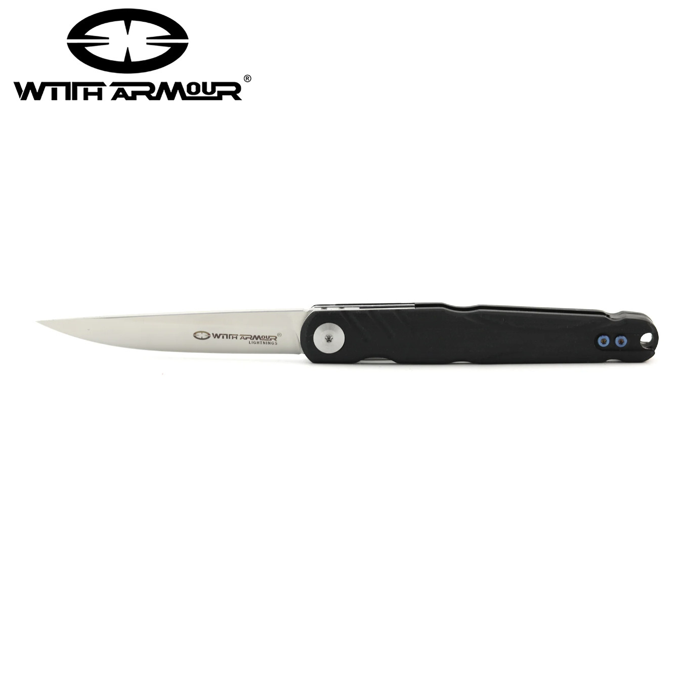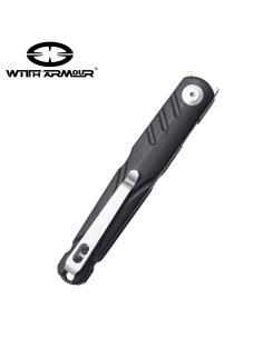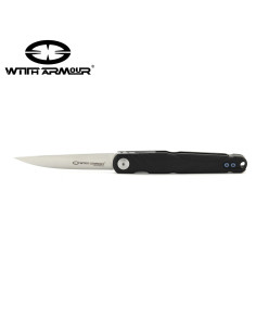 Coltello tattico con lama di 76 mm e finitura nera lavata a pietra, acciaio D2 e manici G10 neri senza texture.