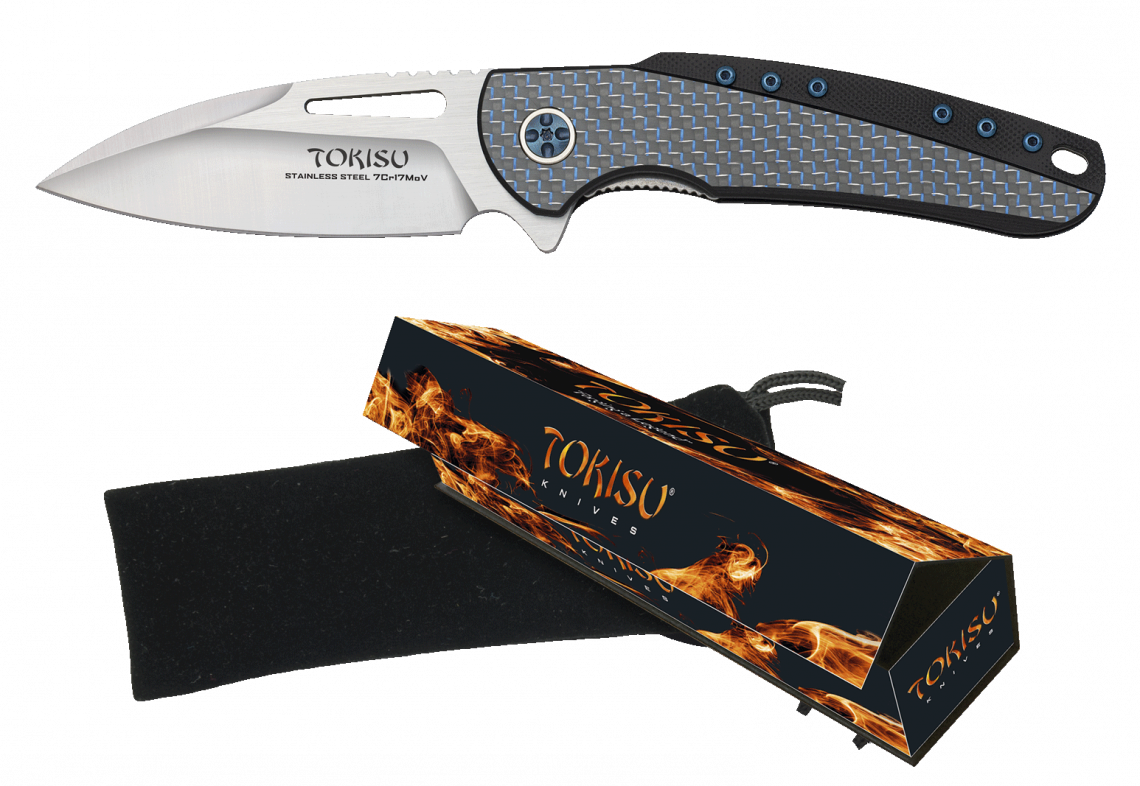 Cerchi un coltello che unisca alta qualità e design elegante?Il Coltello Tokisu con manico in G10 e fibra di carbonio blu è la scelta perfetta per te!