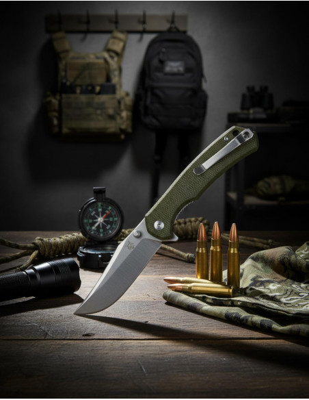 Vuoi acquistare il Coltello tattico D2 con manico in Micarta verde e sentire la differenza? Il suo design pieghevole e il pomello metallico per l'apertura facilitano l'uso con una mano, perfetto per chi valuta la praticità senza sacrificare la robustezza.