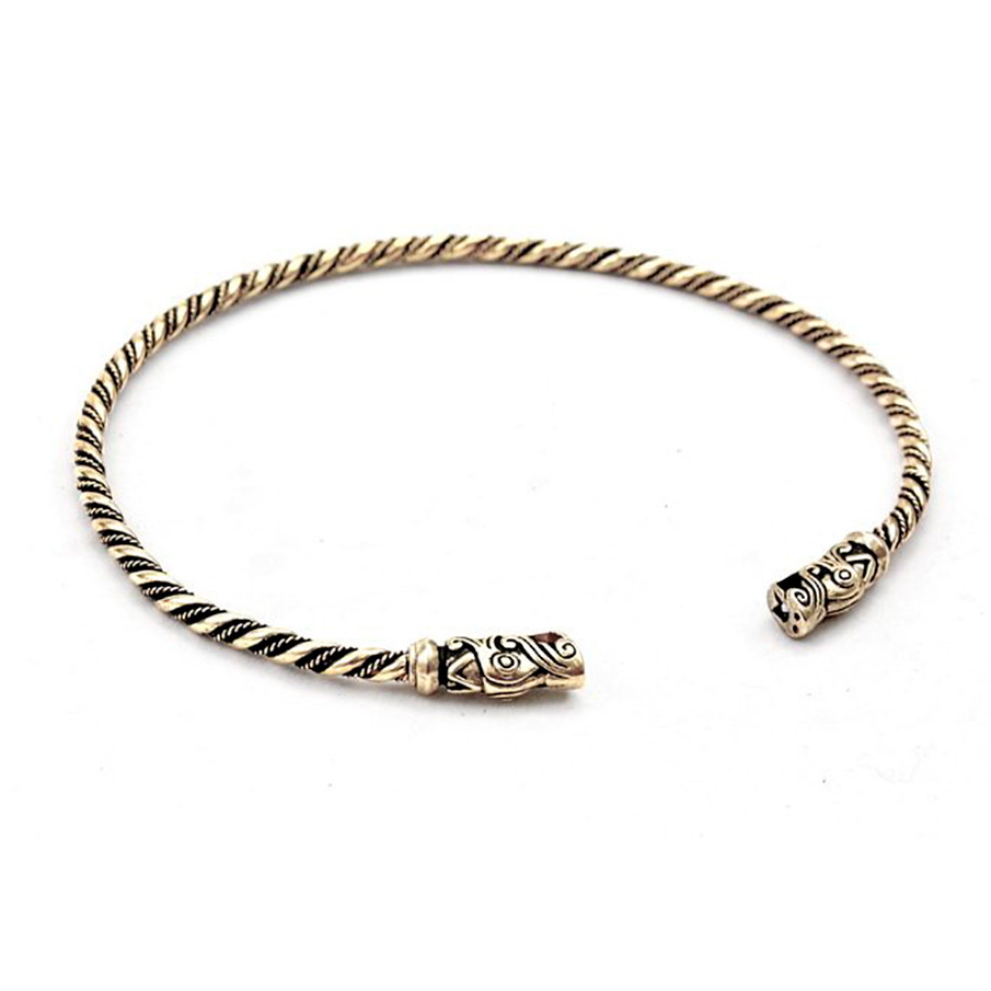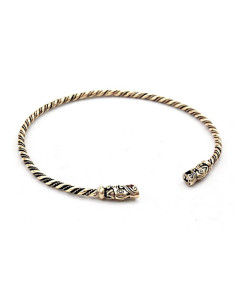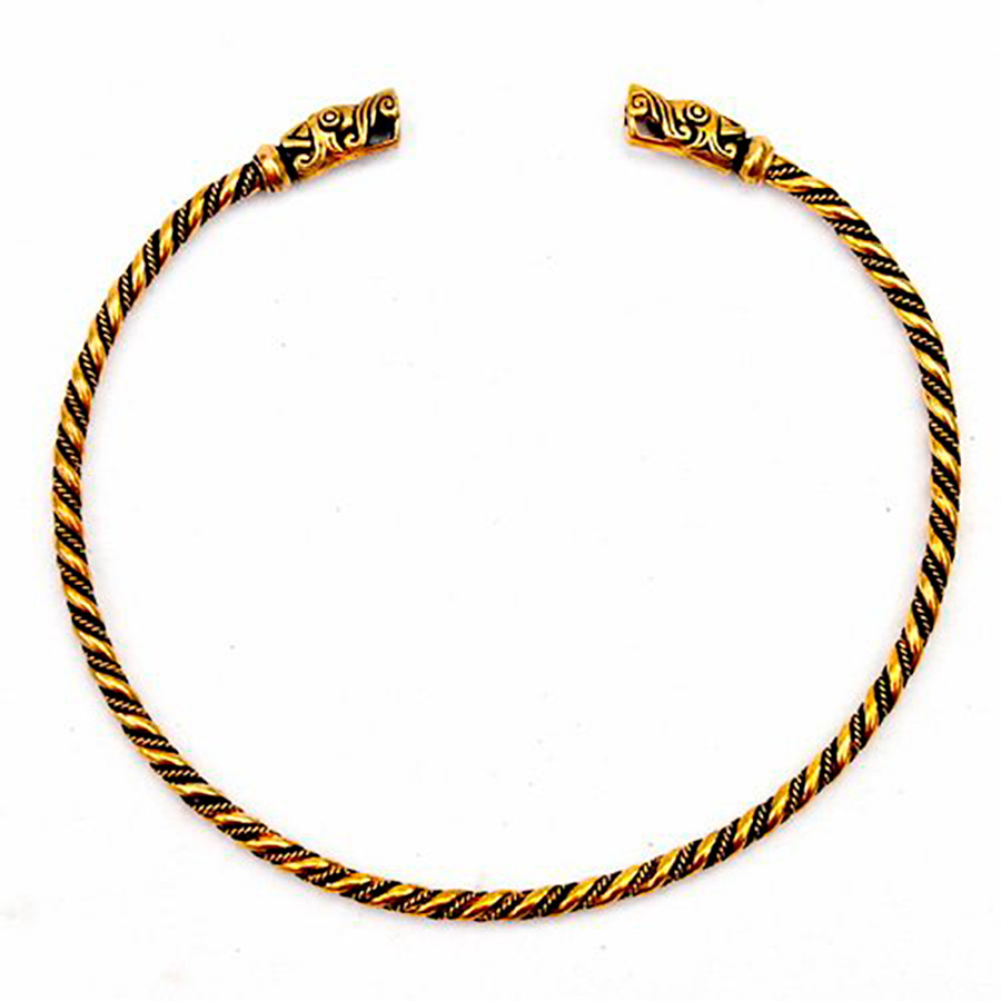 La Torque Viking Gotland Dragon Heads è una collana storica ispirata ai modelli vichinghi. È una collana di diversi fili di bronzo intrecciati che ha un disegno di teste di drago, in onore dell'affascinante cultura vichinga. Questo particolare modello è una replica storica basata su disegni trovati sull'isola svedese di Gotland.
