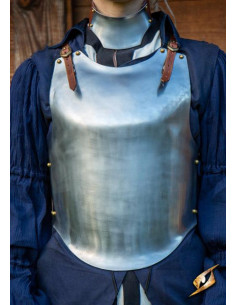 L'armatura del busto è costituita da piastre anteriori fissate con cuoio conciato al vegetale a due piastre posteriori inferiori. Queste piastre posteriori possono essere fissate insieme, rendendo questa armatura una combinazione di piastra anteriore e posteriore. Ciò fornisce una protezione completa e garantisce che sarai preparato per qualsiasi situazione.