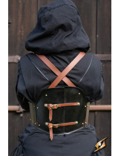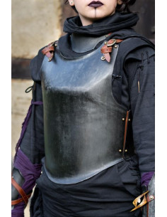 La corazza dell'avventuriero rinnegato con finitura Epic Dark è un'armatura per il busto progettata per una protezione ottimale e movimenti fluidi. Realizzata a mano in acciaio dolce spesso 1 mm, questa protezione per il torace presenta una piastra frontale malleabile che si adatta perfettamente alla forma del corpo, fornendo un'ottima protezione senza compromettere la mobilità.