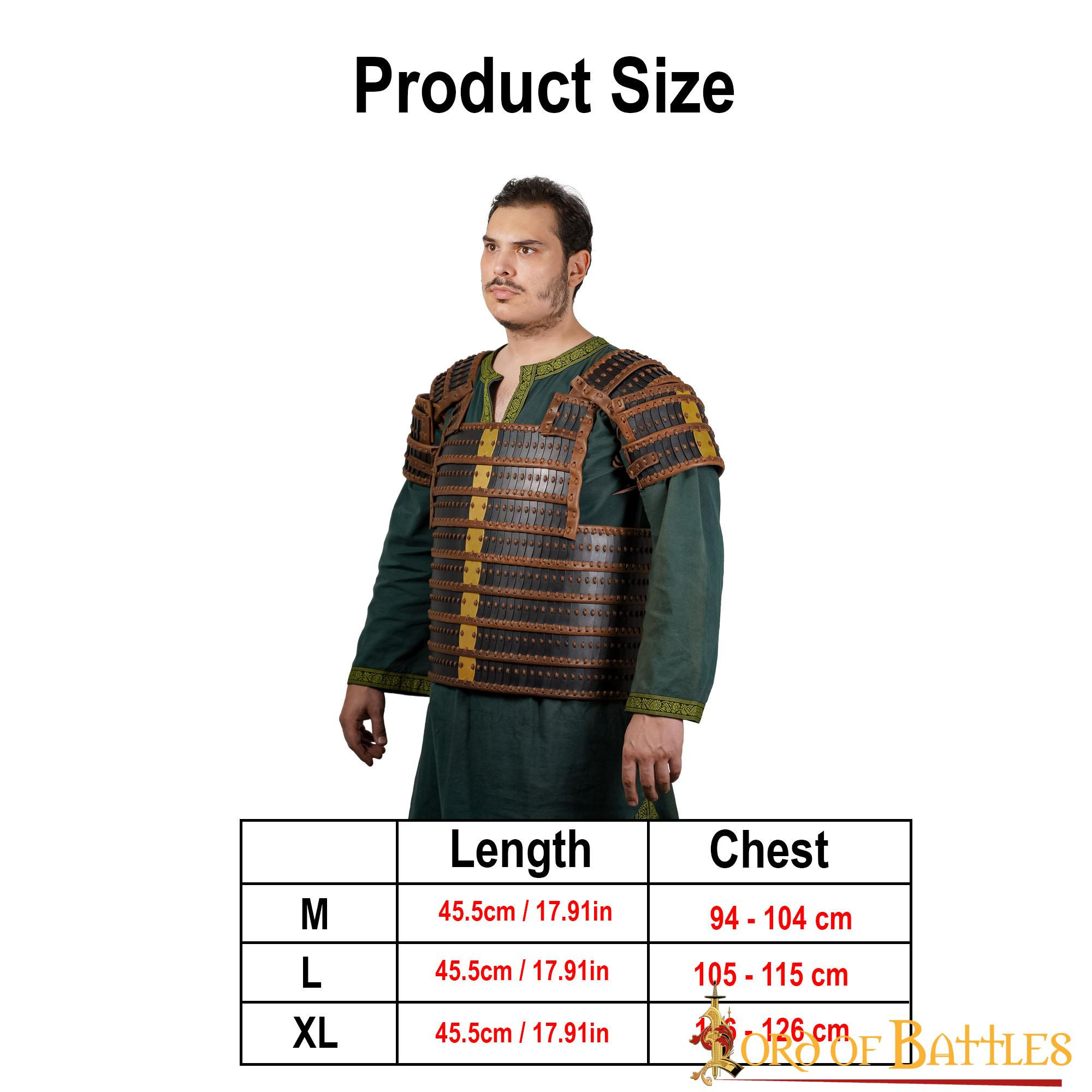 Uno dei vantaggi eccezionali di questa armatura è la sua versatilità nelle dimensioni. È disponibile in tre opzioni: Medium (torace 94-104 cm), Large (torace 105-115 cm) ed Extra Large (torace 116-126 cm). Ricordati di misurarti CON un gambeson se necessario per ottenere la taglia ideale che si adatta al tuo corpo e al tuo stile di combattimento.
