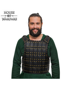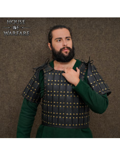 Questa corazza in pelle genuina non solo offre una protezione ispirata alle valorose guerriere e soldati dell'Età Media, ma garantisce anche la libertà di movimento necessaria per mantenerti in azione durante lunghe giornate o combattimenti scenici. La griglia di piastre rettangolari, chiodate con bronzo, non solo evidenzia il suo stile robusto, ma assicura grande durata e resistenza.