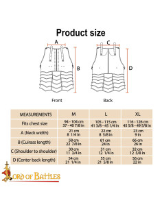 Le cinghie in cuoio genuino e le fibbie in acciaio assicurano una vestibilità ferma e personalizzabile, con molteplici punti di chiusura per indossarla aderente in battaglia o più rilassata durante lunghe giornate in fiera. La lavorazione in cuoio rinforza la durata, mantenendo la corazza pronta all'uso dopo uso.