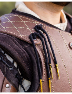 Il cuoio di alta qualità punta sulla durabilità e una patina che migliora con l'uso, mentre i rivetti e i dettagli dorati sui lacci gli conferiscono un'aria lavorata, adatta per ricostruzioni storiche e scherma con stile. Insieme, offre una silhouette pratica e convincente, pronta ad accompagnarti in qualsiasi scena di avventura o evento tematico.