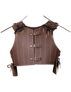 Se desideri acquistare il Pettorale medievale in cuoio modello Strigo, colore marrone, godrai di un pezzo versatile che funziona sia come nucleo di un'armatura modulare che come pezzo indipendente con grande presenza. Le tre fibbie frontali e la cintura inferiore assicurano il pettorale in posizione, evitando scivolamenti e facilitando la sua rapida collocazione.