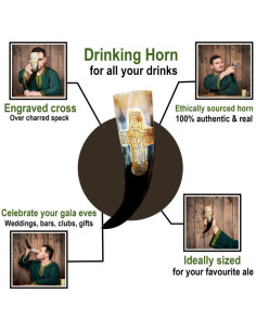 Corno vichingo con croce incisa. Realizzato a mano con corno di bue di provenienza etica, la capacità totale del corno è di ca. 400-500 ml (di un liquido con gradazione alcolica fino al 20%). Evitare lavastoviglie e bevande calde. Prima dell'uso, assicurarsi di lavare sotto l'acqua corrente. Per una durata maggiore, trattare con cera d'api dopo ogni utilizzo. Si prega di notare che questo è un prodotto naturale che si decompone nel tempo e quindi possono apparire crepe.