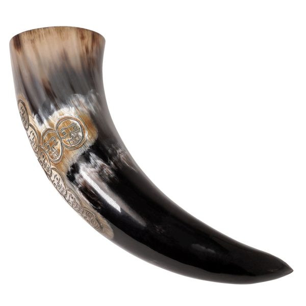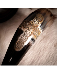 Cerchi un modo unico per gustare i tuoi drink preferiti? Non cercare oltre, abbiamo il prodotto perfetto per te: il corno da bere vichingo con un design a croce di teschi. Questo eccezionale corno potorio è stato realizzato a mano da un vero corno di bue, il che significa che ogni pezzo è completamente unico e ha il suo carattere e il suo fascino.