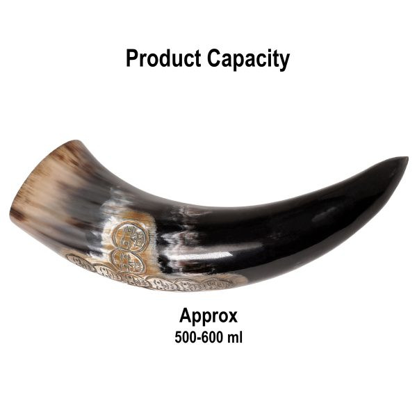 Con una capacità totale di circa 500-600 ml, questo corno è l'ideale per gustare una birra rinfrescante con i tuoi amici o per aggiungere un tocco speciale alla tua decorazione. Ma non è tutto! Questo corno presenta anche un'impressionante croce di teschio incisa su un granello carbonizzato, che gli conferisce un aspetto robusto e visivamente accattivante.