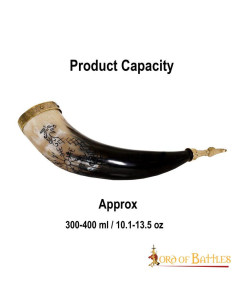 Con una capacità totale di circa 300-400 ml, questo corno ti permetterà di goderti le tue bevande preferite con stile. Inoltre, il suo particolare design lo rende ideale per contenere liquidi fino al 20% di gradazione alcolica, così potrai gustare idromele o altre bevande tradizionali vichinghe senza preoccupazioni.