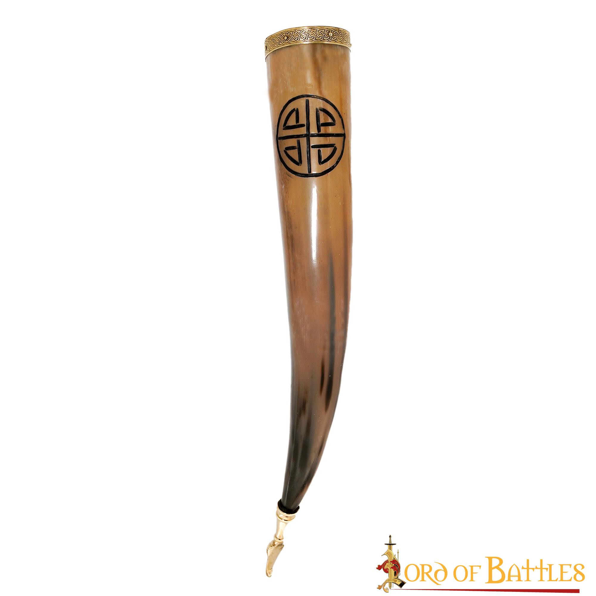 Corno potorio con nodo celtico. Questo corno per bere è stato realizzato a mano da un vero corno di bue. La capacità totale del corno è di ca. 300-400 ml (di un liquido con gradazione alcolica fino al 20%). Evitare lavastoviglie e bevande calde. Prima dell'uso, assicurarsi di lavare sotto l'acqua corrente. Per una durata maggiore, trattare con cera d'api dopo ogni utilizzo. Si prega di notare che questo è un prodotto naturale che si decompone nel tempo e quindi possono apparire crepe.