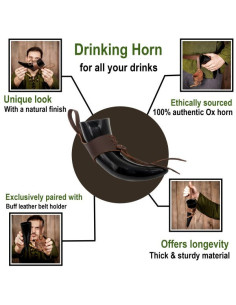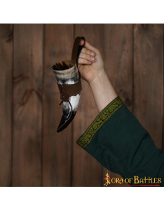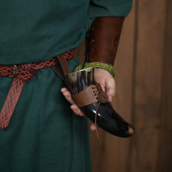 Per un maggiore comfort, il corno per bere vichingo include un pratico baldric in vera pelle, che ti permetterà di portarlo con te in tutte le tue imprese. Inoltre, quando non lo usi, puoi riporlo nella sua resistente borsa in tela di cotone, insieme alle tue feroci spade e armi.