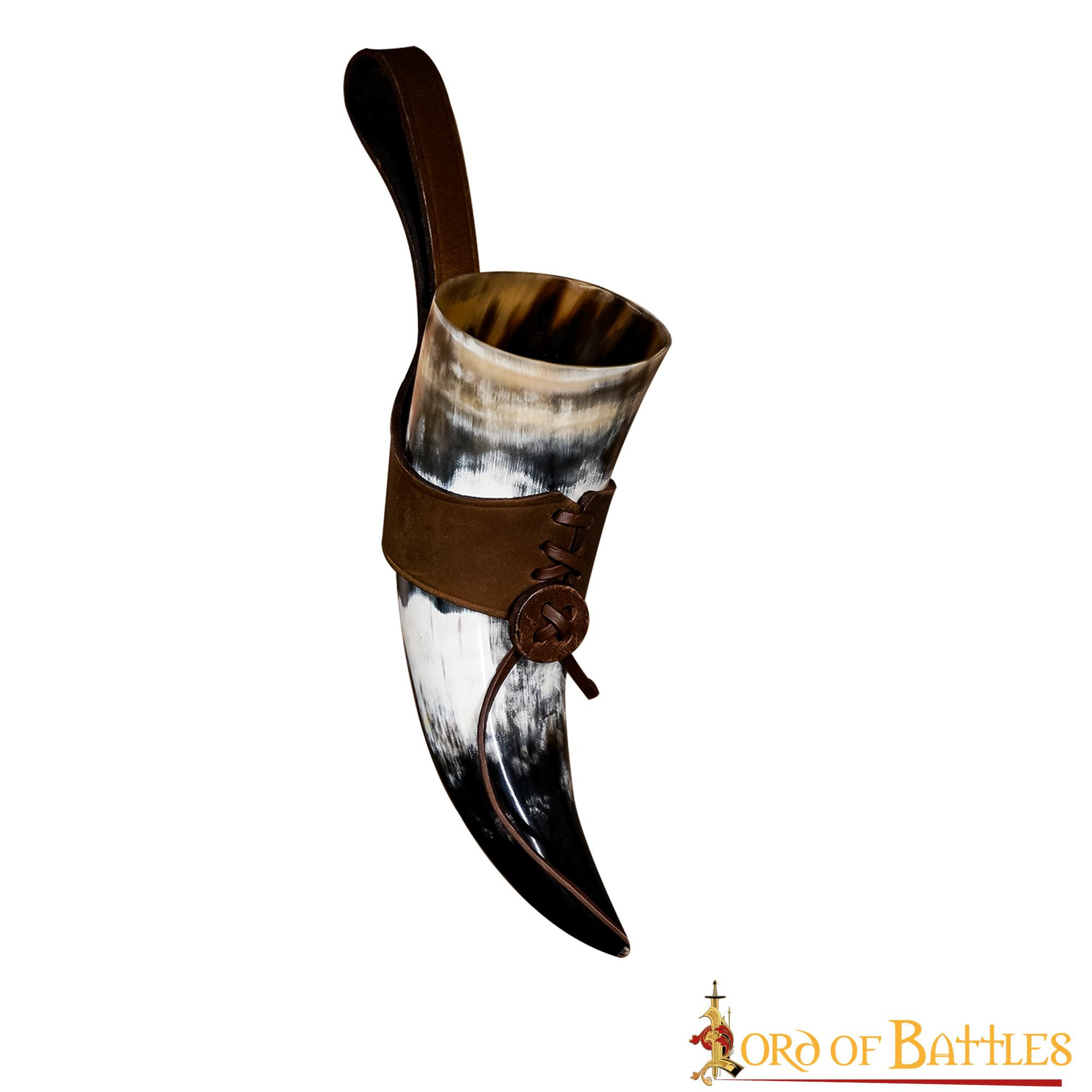 Scopri il corno potorio vichingo con balte in pelle, l'accessorio perfetto per gli amanti della storia e della cultura vichinga. Questo corno potorio è stato meticolosamente realizzato a mano da un vero corno di bue, conferendogli un'autenticità come nessun altro.