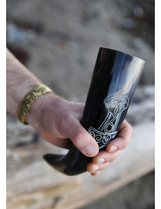 Il corno potorio che offriamo qui è realizzato a mano in corno bovino, lucidato e impreziosito da un motivo inciso di Mjölnir, il potente martello di Thor, il dio nordico del tuono e la seconda divinità più alta dopo suo padre Odino.