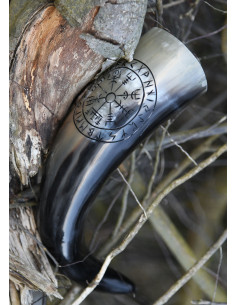 Il corno potorio che proponiamo qui è realizzato a mano in corno bovino, lucidato e impreziosito da un'incisione vegvísir incorniciata da una sequenza di rune. Il vegvísir (esploratore) è un simbolo magico o cosiddetto sigillo (galdrastafir) di origine islandese. Una rappresentazione reale di questo simbolo appare per la prima volta nel manoscritto islandese del 1860 Huld de Geir Vigfússon, una raccolta di rune/incantesimi e sigilli. Lì dice: