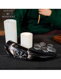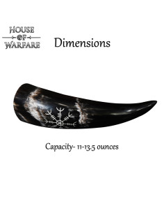 Questo corno non è solo un oggetto per bere, è un simbolo di protezione e coraggio vichingo. Preparati a bere nel potere e nella protezione dell'Aegishjalmur, scolpito a mano in questo raro corno!