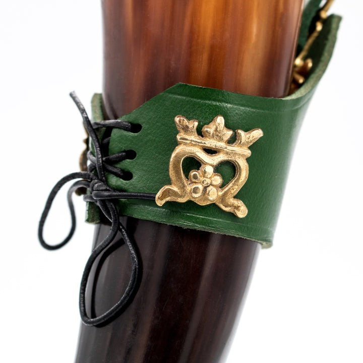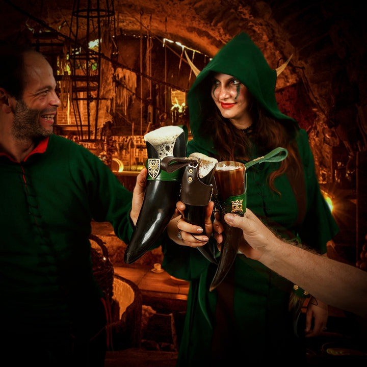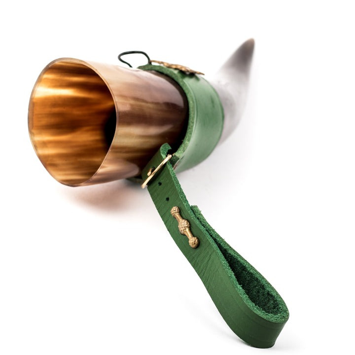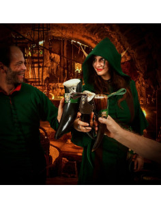 Questo corno potabile vichingo, modello Dama Elegante con cinturino in pelle verde, è il pezzo ideale per qualsiasi evento medievale o celebrazione a tema. Con una capacità di 250 ml, offre il perfetto equilibrio tra dimensioni e funzionalità: abbastanza compatto da poter essere trasportato comodamente ovunque e con il giusto volume per dissetare anche il guerriero vichingo più assetato. È la perfetta combinazione di stile e praticità.